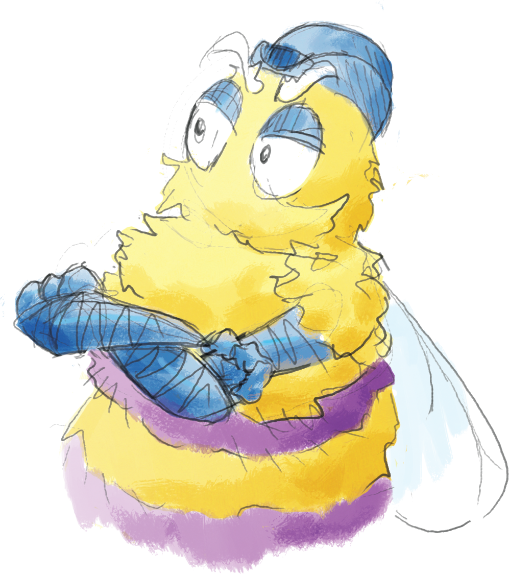 A traveling pollen salesman, tired of the nine-to-five shuck and jive of the hive. This fuzzy drone escaped his colony, in search of a quiet meadow. Arthur set out with his bags and bowler hat, looking forward to camping out on a pansy with a cup of steaming nectar, while watching the sun rise.